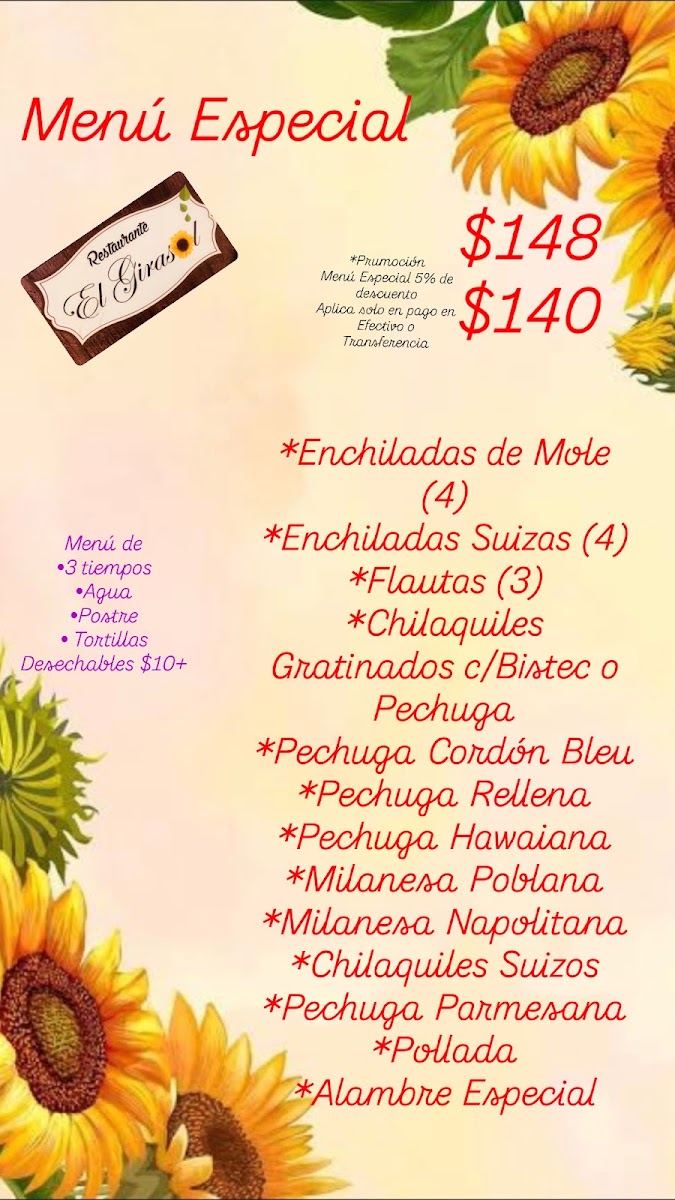 El Girasol is a standout Mexican restaurant nestled in Gustavo A. Madero, CDMX, offering authentic flavors with a homemade touch. Their Comida Corrida delights with a three-course meal featuring a choice between Sopa Aguada or Sopa Seca, three savory main dishes, refreshing Agua del día, and a dessert—all at an excellent price of MX$106.00. Signature dishes like Chilaquiles Suizos, crispy totopos drenched in green salsa topped with gratinated milanesa, and the juicy Pechuga Cordón Bleu exemplify their commitment to quality and flavor.